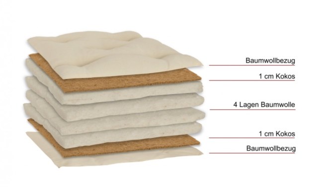 “SLEEP COMFORT: The Vita-line Futon “Model 12” offers rather pure, firm lying feeling. The processed cotton is a traditional filling material for futons and is very resistant. Initially, the futon “Model 12” is 9 - 10 cm high. During the phase of layering, the cotton layers can lose up to 35 % (load dependency) of their initial height, but they become more firm over time and therefore, become more compact. Coconut as a latexed padding material is relatively firm, elastic and dimensionally stable. It is heat-retaining, breathable and resistant to moisture. This futon mattress offers medium-hard sleeping and sitting comfort. The cover is 100 % cotton.